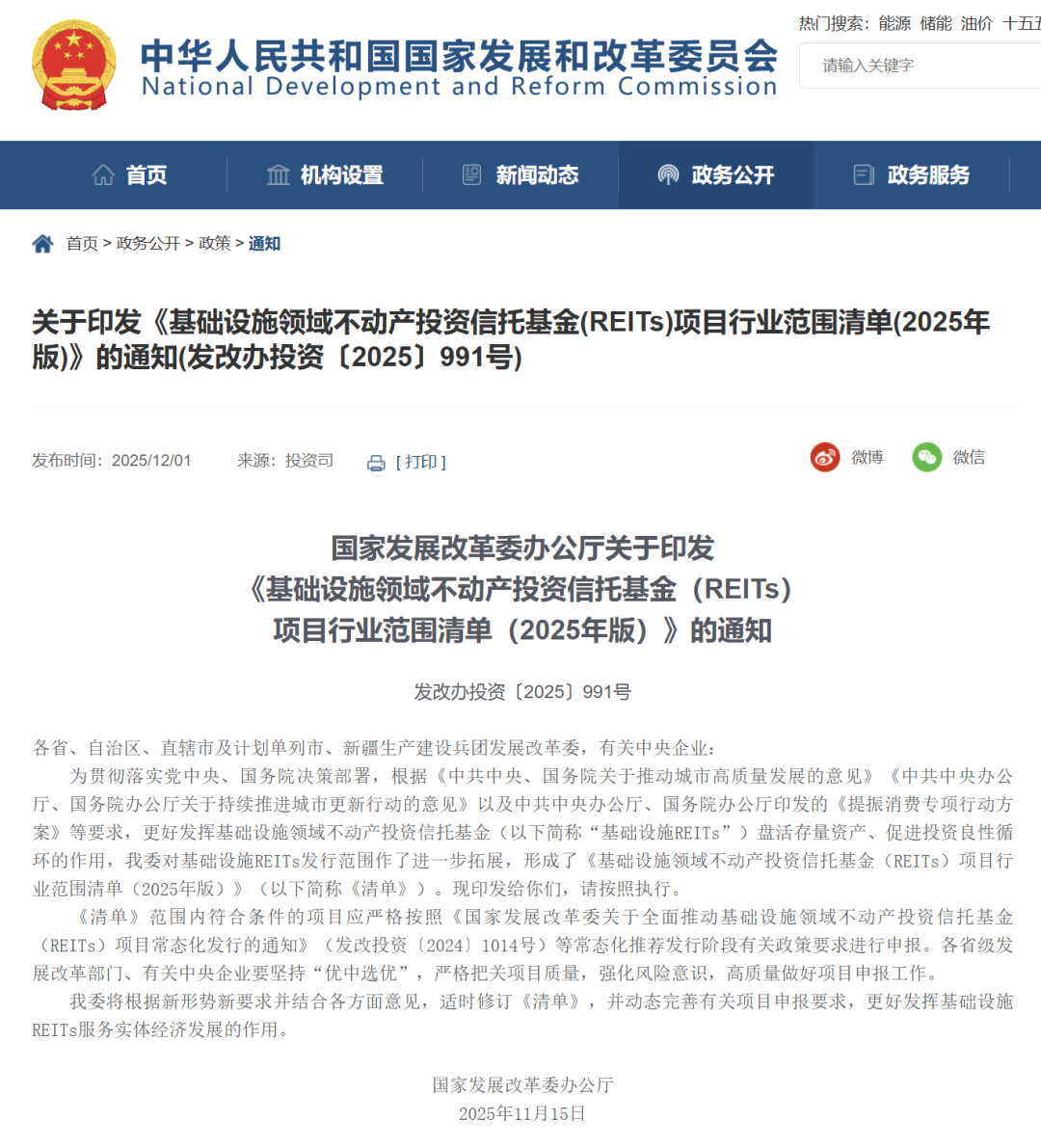 为贯彻落实党中央、国务院决策部署,根据《中共中央、国务院关于推动城市高质量发展的意见》《中共中央办公厅、国务院办公厅关于持续推进城市更新行动的意见》以及中共中央办公厅、国务院办公厅印发的《提振消费专项行动方案》等要求,更好发挥基础设施领域不动产投资信托基金(以下简称“基础设施REITs”)盘活存量资产、促进投资良性循环的作用,我委对基础设施REITs发行范围作了进一步拓展,形成了《基础设施领域不动产投资信托基金(REITs)项目行业范围清单(2025年版)》(以下简称《清单》)。现印发给你们,请按照执行。